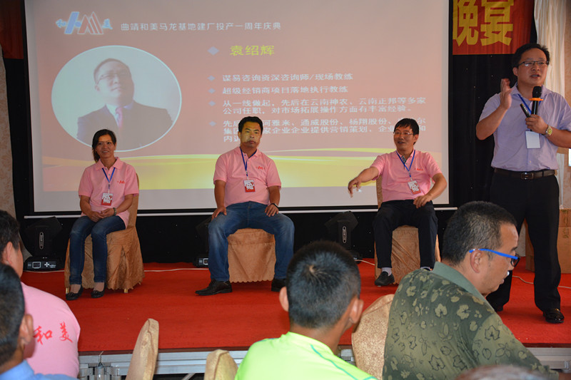 2016年7月25-26日,由联和农牧集团曲靖和美农牧科技有限公司主办的“曲靖和美周年庆典”大会在曲靖博泰大酒店盛大召开。此次庆典邀请到了来自云南省各区域的100余位优秀经销商。并邀请到了来自农牧行业顶尖咨询机构-谋易咨询首席顾问官王中老师及资深咨询师袁绍辉老师。联和农牧集团云贵片区营养师曾欢水博士、曲靖和美农牧科技有限公司总经理梁静、云贵片区生产总监李志强、财务总监刘平等各区域经理参加此次庆典活动。会议由谋易咨询袁绍辉老师主持。
